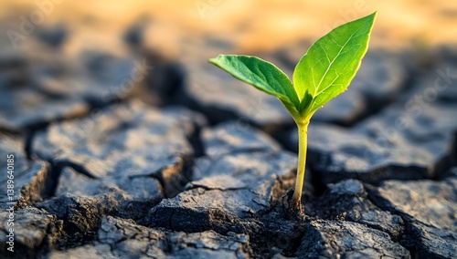 Small green plant grows from cracked dry earth symbolizing hope and resilience.