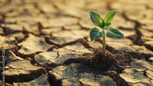 Small Plant Thriving in Cracked Dry Landscape under Sunlight