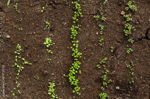 small sprouts of s of spinach, salad, lettuce, arugula in the ground. spring seedlings for the garden growing in the open field, gardening at home, planting background. organic food concept