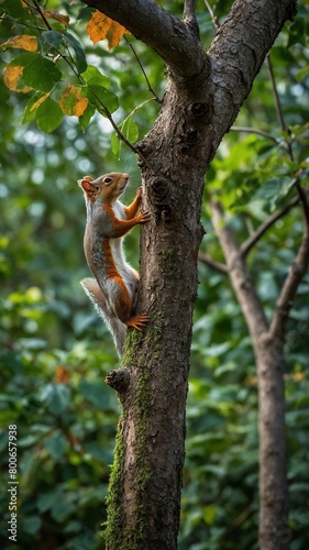 Small squirrel with reddish-brown fur climbs up trunk of tree, its sharp claws gripping rough bark. Animal's bushy tail hangs down behind it, its bright eyes focused on something in distance.