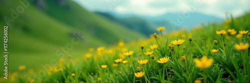Small yellow flowers blooming on a grassy hillside, grass, flora
