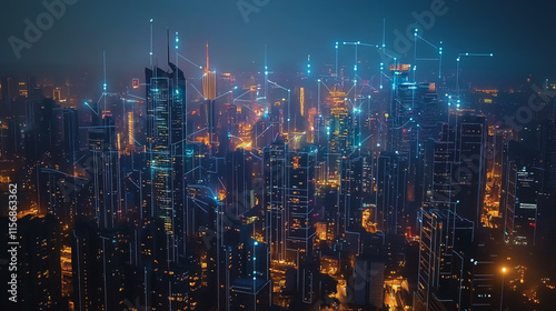 Smart digital Innovation city with connection network reciprocity over the cityscape. of future smart wireless city and social media networking systems that connects business people with in city