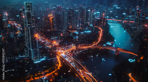 Smart digital Innovation city with connection network reciprocity over the cityscape. of future smart wireless digital city and social media networking systems that connects people with in city