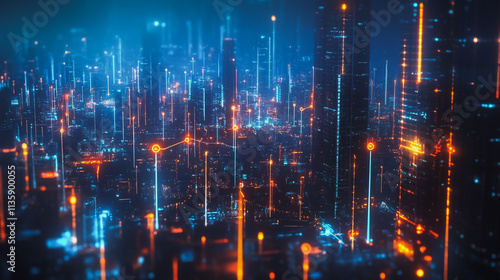 Smart digital Innovation city with connection network reciprocity over the cityscape. of future smart wireless digital city and social media networking systems that connects people with in city