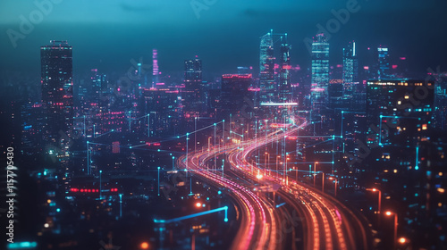 Smart digital Innovation city with connection network reciprocity over the cityscape. of future smart wireless digital city and social media networking systems that connects people with in city