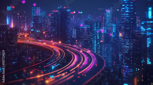 Smart digital Innovation city with connection network reciprocity over the cityscape. of future smart wireless digital city and social media networking systems that connects people with in city