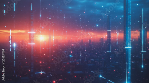 Smart digital Innovation city with connection network reciprocity over the cityscape. of future smart wireless digital city and social media networking systems that connects people with in city