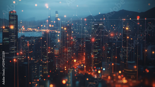 Smart digital Innovation city with connection network reciprocity over the twilight cityscape. of future smart wireless digital city and social media networking systems that connects people with city