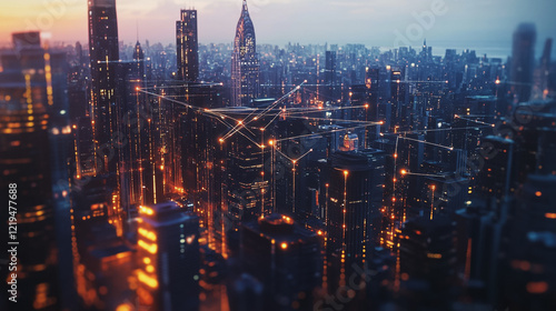 Smart digital Innovation city with connection network reciprocity over the twilight cityscape. of future smart wireless digital city and social media networking systems that connects people with city