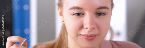 Smart girl looks at computer monitor and holds pen