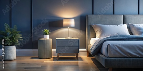 Smart home assistant on nightstand beside bed in modern bedroom with sleek furniture and dimly lit room ambiance, nightstand, smart home