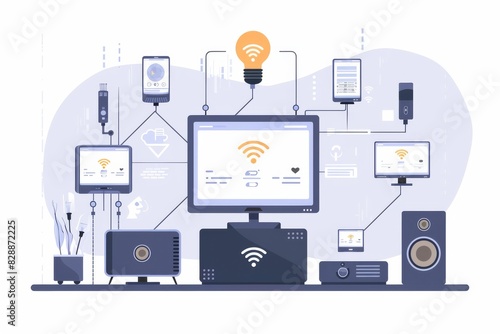 Smart home technology illustration with multiple devices, representing connectivity, automation, and digital living on a white background