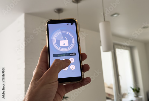 smart house, home automation, device with app icons. Man uses his smartphone with smarthome security app to unlock the door of his house.