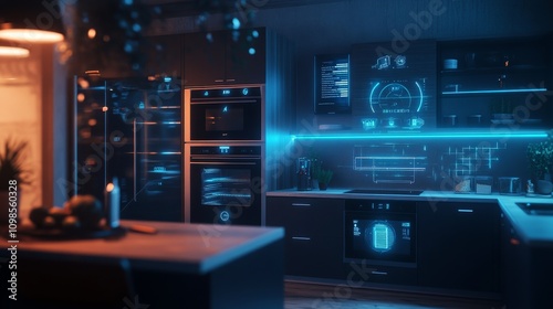 kitchen, modern, smart, futuristic, design, technology, appliance, integrated, digital, interactive, illumination, light, blue, glowing, panel, screen, control, oven, refrigerator, cooking, home, interior, contemporary, equipment, appliance, innovative, future