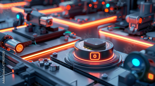 Smart sensors on production equipment, neon highlights, macro lens, datadriven process optimization, intelligent factory