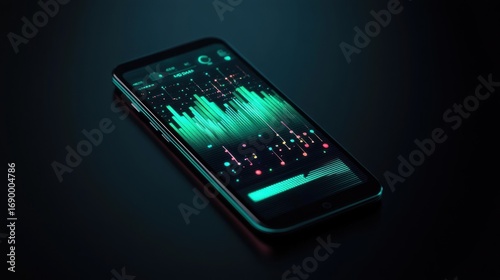 Smartphone displaying a futuristic digital data interface with glowing green and red bar graphs and circular data points on a dark surface emitting a tech vibe