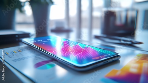 Smartphone displaying vibrant financial graphs on a desk with paperwork.
