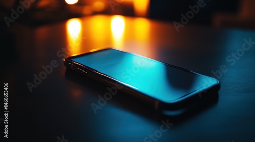 Smartphone on dark table, warm light reflection. Stock photo