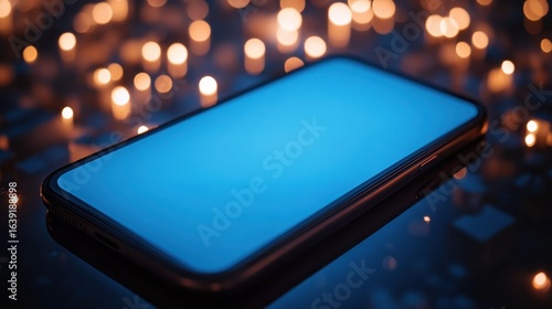 Smartphone on Table with Soft Candlelight Background and Blue Screen