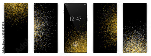Smartphone wallpapers set. Confetti holiday backgrounds. Golden glitter sparkles. Smartphone vector mockup.