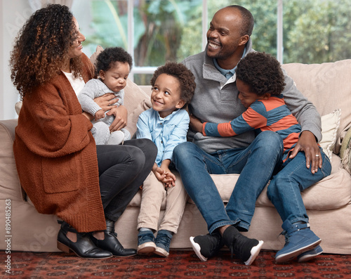 Smile, black family and hug on sofa for love, trust and support in living room. Parents, children and relax at home for cuddle, relationship development and security on couch with happiness or care