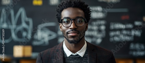 prof, black, man, smiling, blackboard, sketch, mathematic, teacher, learning, education, academic, university, student, goggles, thoughtful, portrait, head shot, photogenic, smart, cognition, intelligence, beard, young, adult, person, confident, expertise, background, suit, classroom, school, science, technology, engineering, mathematic, stem, lecturer, college, teaching