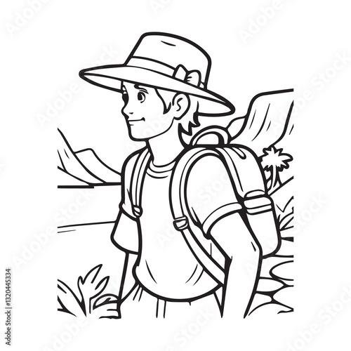 boy, hiker, backpacker, traveler, adventure, nature, mountain, landscape, hiking, exploration, vacation, summer, spring, cartoon, children, children, colouring, illustration, drawing, black-and-white, line art, monochrome, simple