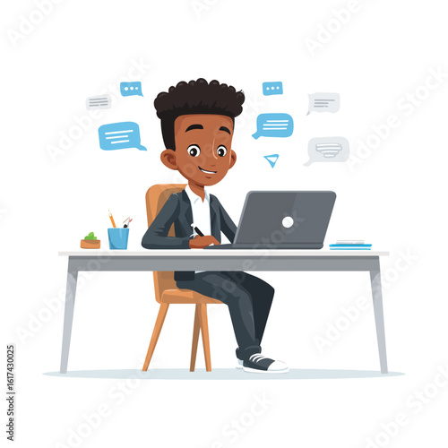 boy, children, children, laptop, computer, technology, online, messaging, communication, chat, message, bubble, screen, digital, cyberspace, learning, studying, education, school, student, desk, chair, table, room, office, workspace, work, home, happy, smiling, cheerful, confident, sharpened, concentration, young, african, black, dark, skin, hair, curly, illustration, cartoon, graphic, design, drawing, image, picture