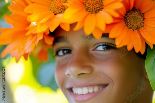 Smiling brazilian teenager boy with tt hair wearing orange flower circlet on his head. Sunny daylight. Happy vacation time holidays conceptual art. Boho-style floral wreath for boys.