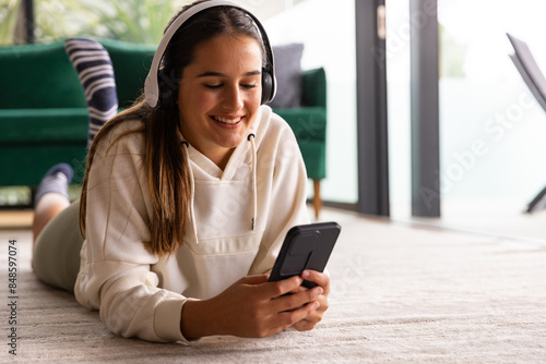 Smiling Caucasian woman in leisurewear at home, listening to music on headphones and smartphone