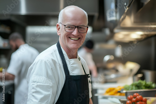 Smiling chef in a professional kitchen, surrounded by fresh ingredients