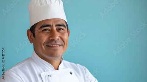 Smiling Chef Portrait: A chef, his face illuminated by a warm smile, stands confidently in his crisp attire, showcasing his expertise and culinary passion.