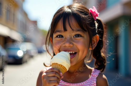children, ice cream, happiness, summer, outdoors, girl, joy, eating, cone, dessert, smile, sunny day, childhood, fun, tasty, treat, cute, leisure, playful, food, sweet, indulgence, freshness, carefree, innocence, delicious, melting, street, casual attire, content, young, lifestyle, cheerful, flavorful, refreshment, delightful, summer, relaxed, enjoying