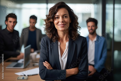 Smiling confident business leader looking at camera and standing in an office at team meeting. Portrait of confident businesswoman with colleagues in boardroom. Using digital tablet during a meeting