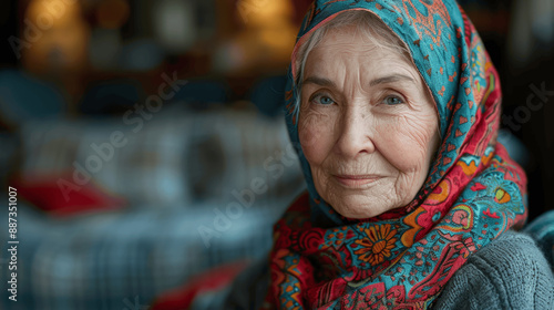 Smiling elderly cancer patient wearing headscarf in hospital room
