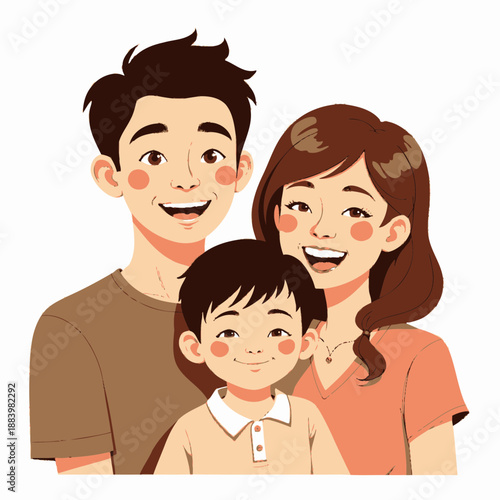 Smiling Family Portrait with Three Happy Individuals Showcasing Joyful Togetherness and Love in a Warm, Colorful Cartoon Style Illustration