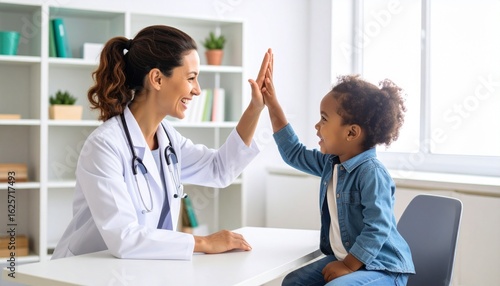 Smiling female doctor give high five to little biracial patient. Detailed high quality.