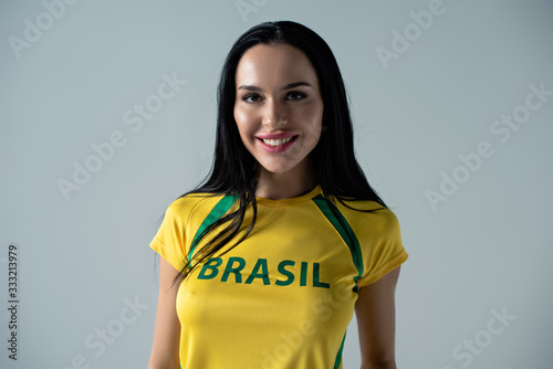 smiling female football fan in yellow t-shirt with brazil sign isolated on grey