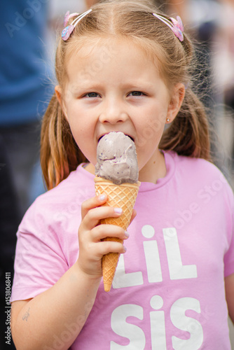 girl, children, children, ice cream, cone, dessert, sweet, summer, treat, cold, food, portrait, closeup, smile, happy, pink, purple, vanilla, chocolate, cream, delicious, tasty, fun, casual attire, cute, blurred, background, hair, face, joy, childhood, hand, holding, cornet, scoop, glacé, daylight, snack, little, toddler, fashion, shirt, love, innocence, natural, beauty, fresh, dark