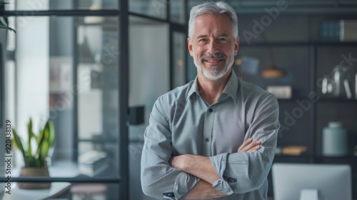 Smiling handsome businessman with crossed arms in modern office, middle-aged gray-haired man exuding confidence, business success concept.