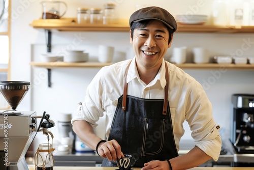 korean, eatery, owner, cafes, hot drink, prepare, cup, smile, white, shirt, apron, black, wood, accent, clean, serve, client, small, holding, beverage, business, entrepreneur, service, hospitality, drink, brewing, kitchen, equipment, countertop, professional, happy, welcoming, positive, friendly, asian, man, male