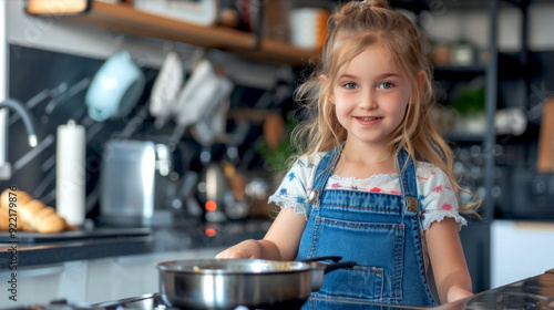 smiling little girl preparing food in the kitchen. girl at the stove preparing breakfast. the child prepares lunch and dinner