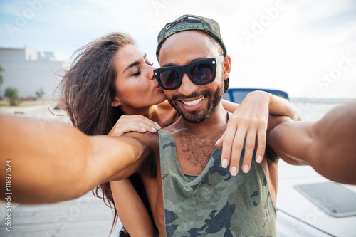 Smiling man and woman making selfie photo on smartphone