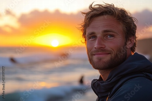 man, smiling, sunset, beach, ocean, relaxed, happy, warm, nature, peaceful, wave, horizon, outdoors, golden hour, summer, travel, serene, freedom, beauty, joy, holiday, calmness, casual attire, breeze, vacation, sunlight, positivity, bright, scenic, calm