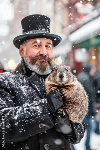 man, silk hat, coat, groundhog, snow, winter, celebration, tradition, holiday, cultural, event, outdoors, urban, smiling, historic, festive, american, february, seasonal, annual, furry, animal, ceremony, heritage, portrait, joyful, festive attire, winter scene, city