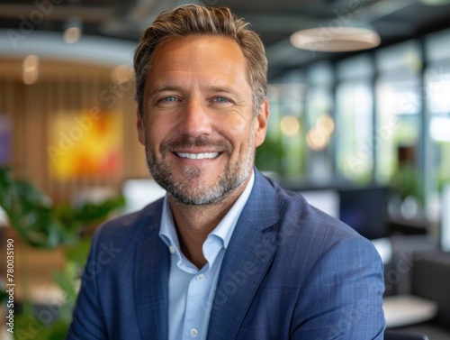 man, smiling, blue suit, office, businessman, professional, executive, sitting, desk, chair, workplace, corporate, happy, content, joyful, confident, success, career, work, employee, entrepreneur, attire, business, cheerful, positive, caucasian, male, person, indoor, interior, room, modern, contemporary, successful, leader, manager, fashion, photogenic, white-collar, portrait, corporate environment, company