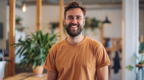 Smiling Man in Casual Orange T-Shirt, Indoor Office Setting with Potted Plant and Wooden Beams