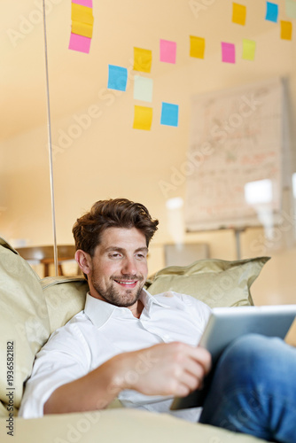 Smiling man in office using tablet in bean bag