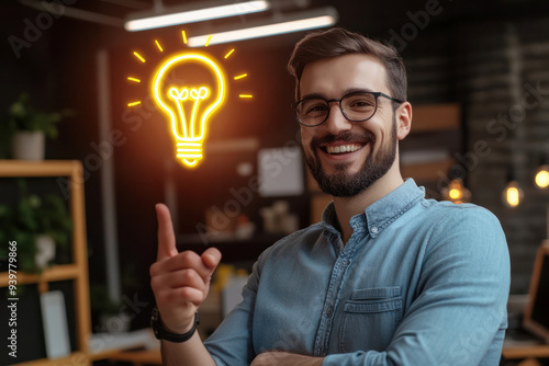 idea, man, light bulb, creativity, innovation, office, smile, inspiration, concept, business, smart, thinking, bright, success, professional, happy, workspace, solution, positive, intelligent, modern, creative, motivation, entrepreneur, glowing, invention, achievement, insight, energy, design, futuristic, leadership, technology, digital, productivity, progress, team, businessperson, planning, workplace, thought