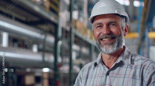 Smiling mature male engineer with hard hat inside a manufacturing facility